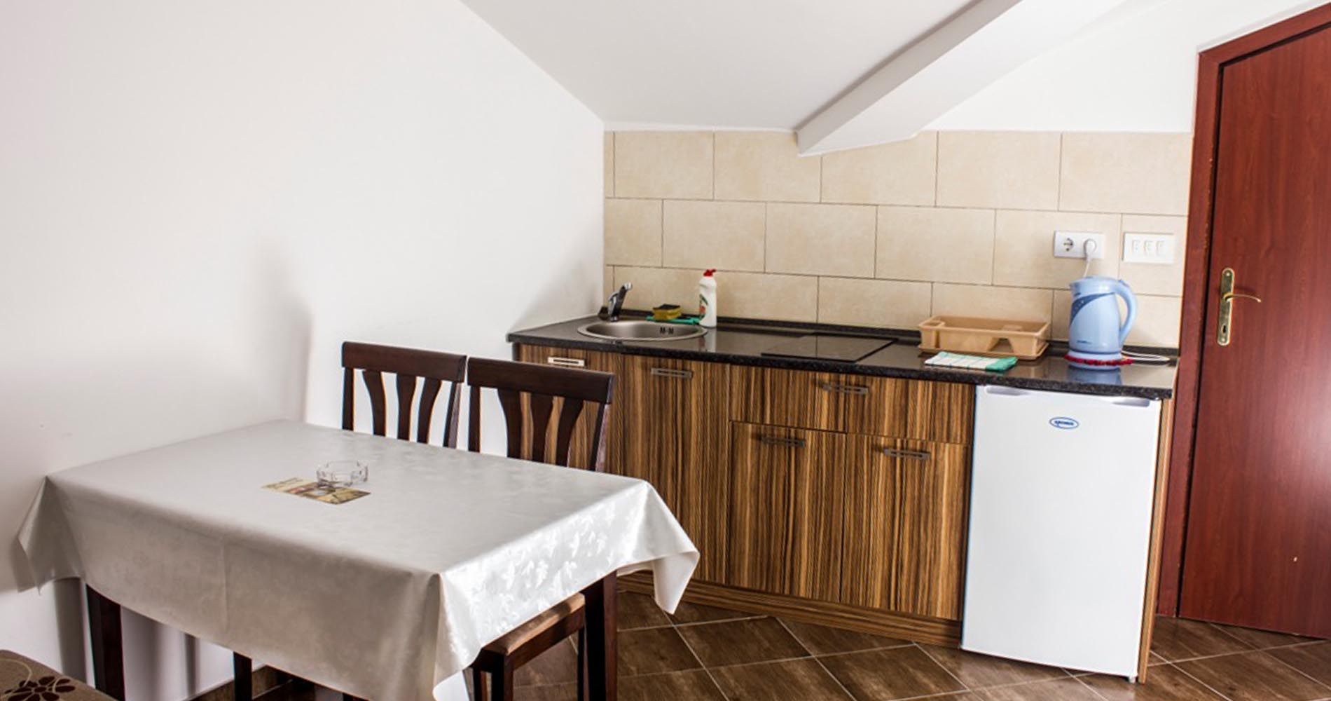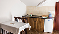 Kuhinja u apartmanu je u potpunosti opremljena i odvojena od spavace sobe. U okviru kuhinje postoji i trpezarijski sto.